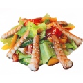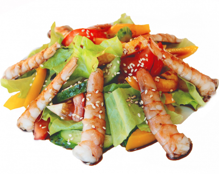 Салат из свежих овощей с тигровыми креветками и фирменной заправкой на основе кунжутного масла.
